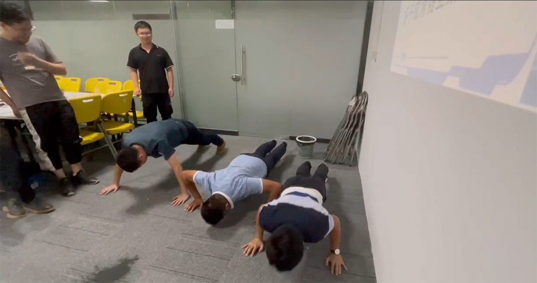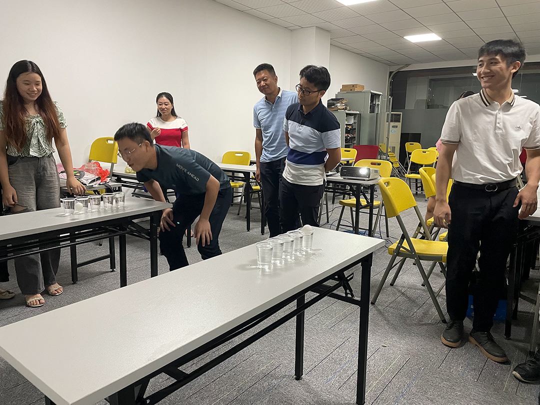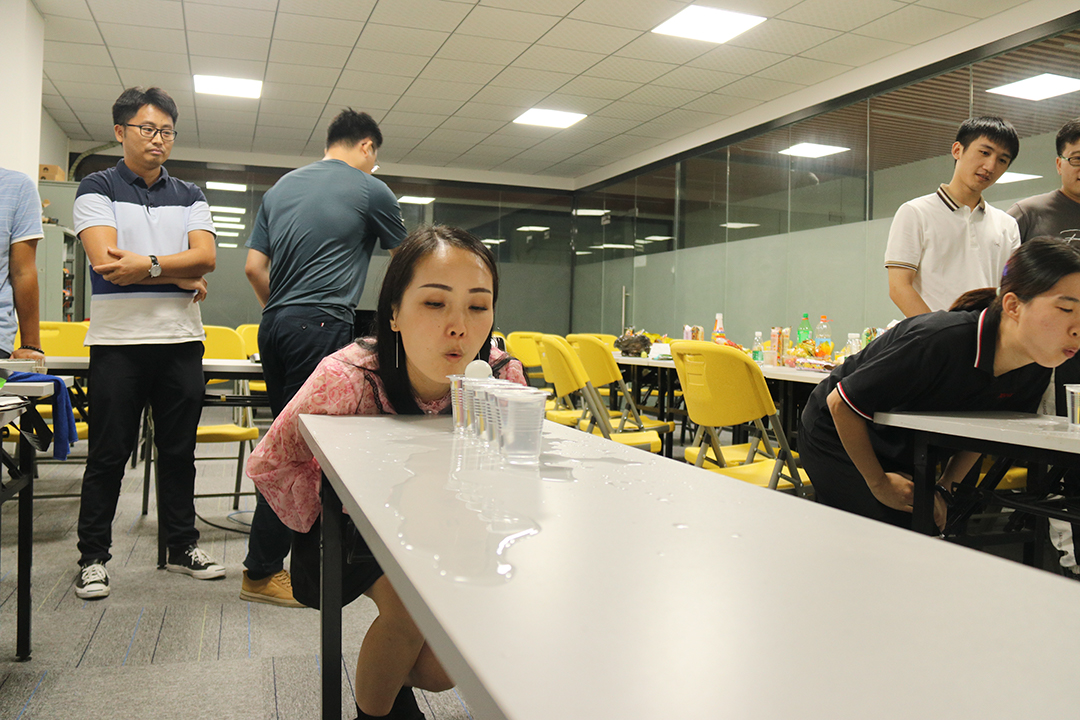 吹乒乓球游戲無疑將座談會推上高潮,新老員工隨機組合,在規定的時間內,參賽者按規則將乒乓球從第一個杯子吹到第六個杯子,并且球始終無跳過杯子或滑落,即為成功,失敗需接受小懲罰。