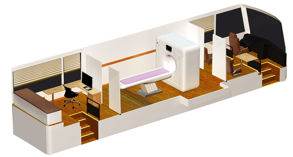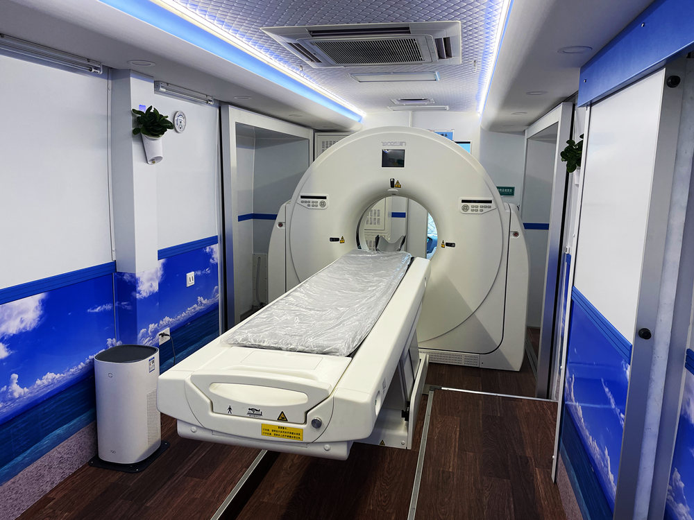 如上圖所示,車頭部分是駕駛室和休息室,車輛中間部分是CT檢查室,車尾部分是影像工作室,這就是移動車載CT車的一個大概布局。車載CT在車身中部,車廂采用拓展式設計,使得車內的操作空間更大,車輛底部配置空氣懸掛,安裝氣囊減震,保障車內CT設備平穩運行。