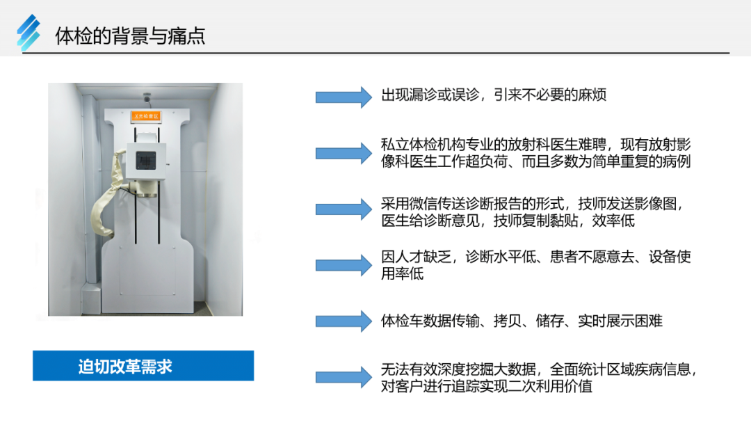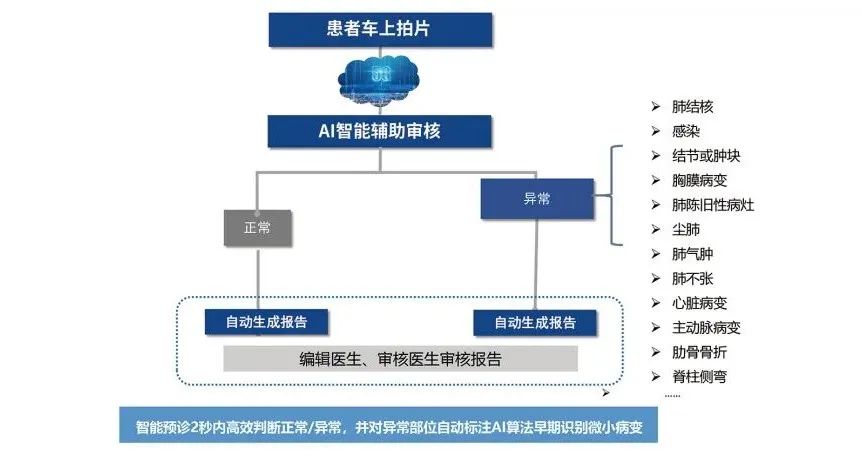 傳統(tǒng)醫(yī)療模式與互聯(lián)網(wǎng)醫(yī)療模式最重要的區(qū)別,就在于是否具備高效的數(shù)據(jù)搜集和分析能力。在傳統(tǒng)的DR醫(yī)療車中,DR檢查結(jié)果存在著高度依賴人工閱片,醫(yī)生工作負荷大、長時間大批量閱片容易導(dǎo)致誤診、漏診等問題。
