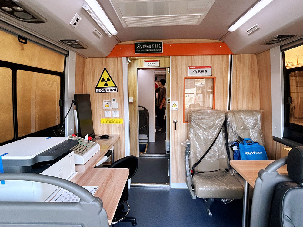 體檢車緊湊實用,車內舒適感強。該車其內部設置有純音電測聽房和X射線室等功能分區,配備有先進的數字DR放射設備、電測聽檢查系統、肺功能儀等儀器,可“一站式 ”完成DR拍片、純音聽閾檢查、肺功能檢查、彩超、心電圖、各類血液、尿液常規檢查,開展內科、外科、耳鼻喉科等各類常規體檢。