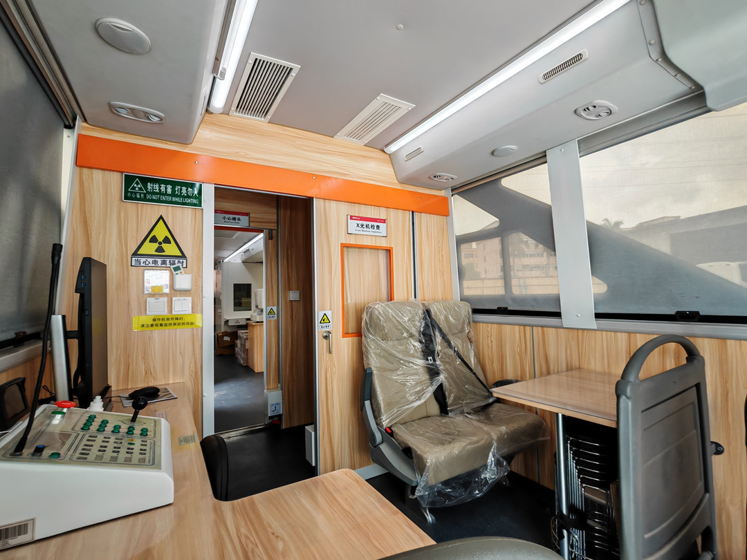體檢車又稱移動醫療車,是為醫療機構設計的可以滿足常規體檢、職業病體檢、結核篩查、應急醫療救援等功能的醫療專用車輛。一般采用大型的醫療專用車改裝,車內空間雖小,功能卻很齊全。車上配裝車載X光機(DR)、心電圖、B超、骨密度檢測儀以及檢查床、醫用冷藏箱、飲水設備、冷暖空調和紫外線消毒燈等醫療設備設施。