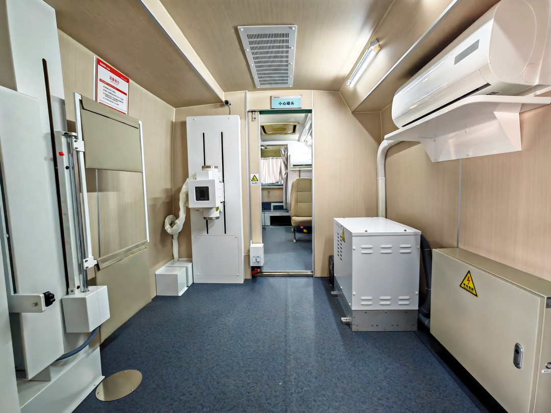 體檢車的升級改造首先體現在硬件設備的全面提升上。早期大部分體檢車的車載X光機為CR和普通X線攝影,這些設備都存在操作繁瑣、輻射較大、清晰度不夠、不能永久保存等缺點,需要升級使用車載DR(數字X線攝影)來取代,而艾克瑞專門研發生產的車載廂式結構的車載DR,具有更好的穩定性、不易晃動,雙鏈條閉環結構,柔性避震,可以更好保護球管和平板探測器,讓設備更耐用,另外像鉛房防護,也需要重新設計制作,以保證檢查過程更加安全。