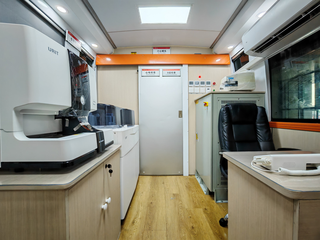 后部搭載DR和電測聽室以及生化檢測設備,可同時進行DR、電測聽、生化檢測等體檢項目,讓整個體檢流程流暢高效。上下層之間還配備有兩部電動升降平臺,方便人員上下。每個區域均配備冷暖空調,CT機房和DR機房均做足六面鉛防護,所有內飾材料均采高端環保材料,可以保障每個體檢項目的檢查過程都更加舒適安心。此外車輛頂部還貼心的設有觀景臺,可供醫護人員工作之余休息和茶歇,放松身心,以更好的精神狀態服務好每一位前來檢查的患者。