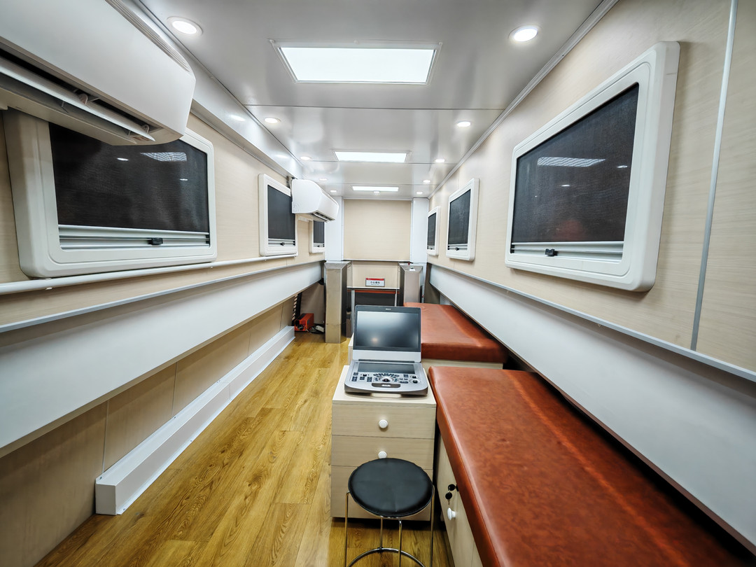 上層,采用頂升結構拓寬設計,配置心電、B超、冷暖空調設備設施,使得心電超聲可并行檢查,檢測效率倍增。下層,采用側展分體倉設計,拓展獨立區域用于CT操作區和患者候診區,可一鍵智控,輕松展收,讓檢查流程更加高效,前部搭載車載CT設備,采用低重心CT機房設計,使得車輛行駛過程穩如磐石,安全同行每一程。