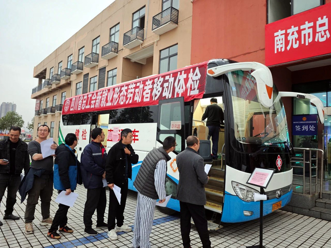 11月23日至29日,四川省總工會成都工人療養院移動體檢車開到南充現代物流園、南充高新技術產業園站點,為1380余名貨車司機、網約車司機、快遞員、外賣配送員、電商從業者等新就業形態勞動者提供免費健康體檢和健康咨詢服務。