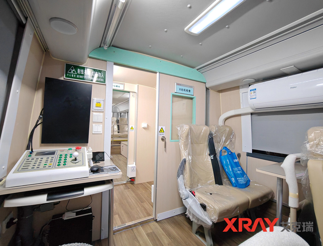 這臺體檢車由深圳艾克瑞生產交付,車長8.2米,車內載有艾克瑞車載X光機、醫用檢查床、冷暖空調等設備設施。可以為人們提供安全高效便捷的上門體檢服務。