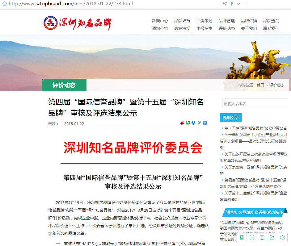 2018年1月19日,深圳知名品牌評價(jià)委員會會議審議了擬認(rèn)定第四屆“國際信譽(yù)品牌”和第十五屆“深圳知名品牌”榮譽(yù)稱號。對自2017年3月28日啟動的第十五屆“深圳知名品牌”評價(jià)活動做出了多角度的審核,并完成了企業(yè)申報(bào)、企業(yè)內(nèi)部管理體系現(xiàn)場評審、社會公眾投票、行業(yè)專家評價(jià)和品牌價(jià)值評估等一系列相關(guān)工作。最終由深圳知名品牌評價(jià)委員會全體委員進(jìn)行了審議評選,經(jīng)深圳市公證處現(xiàn)場公證,并列出認(rèn)定和入選的品牌名單。