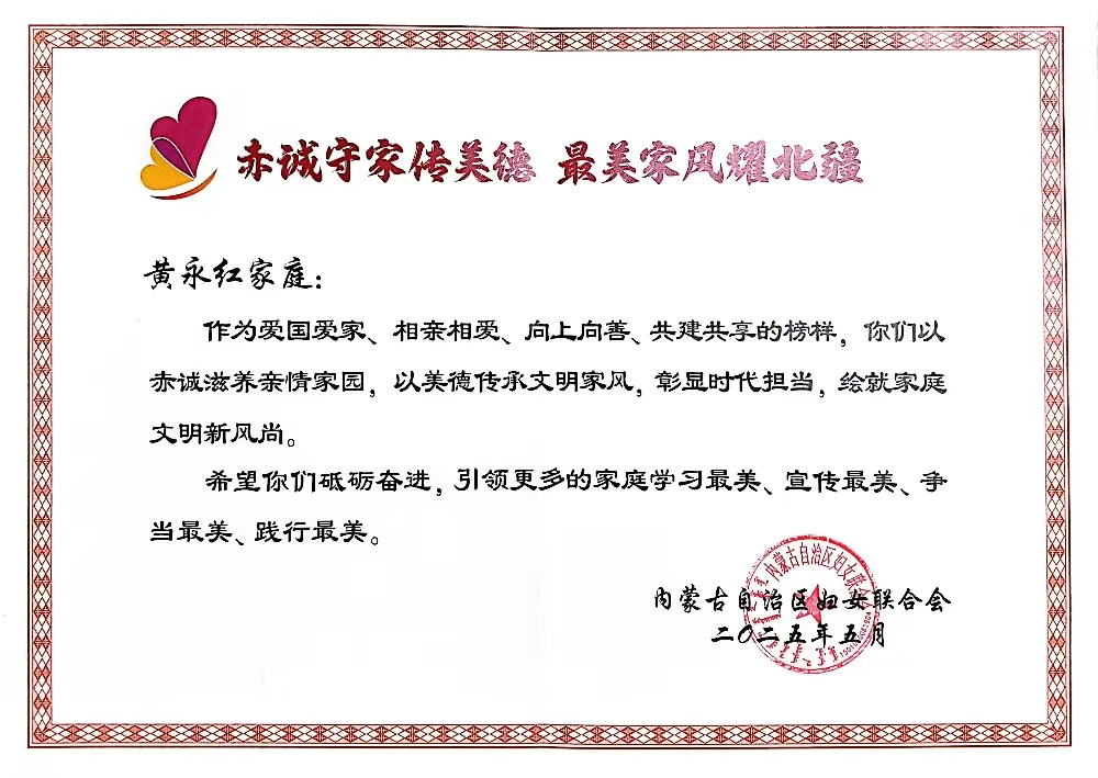 近日,內(nèi)蒙古自治區(qū)婦聯(lián)向全社會(huì)發(fā)布2024年度“最美家庭”,中國(guó)二冶職工黃永紅家庭榮獲2024年度自治區(qū)“最美家庭”榮譽(yù)稱號(hào)。
