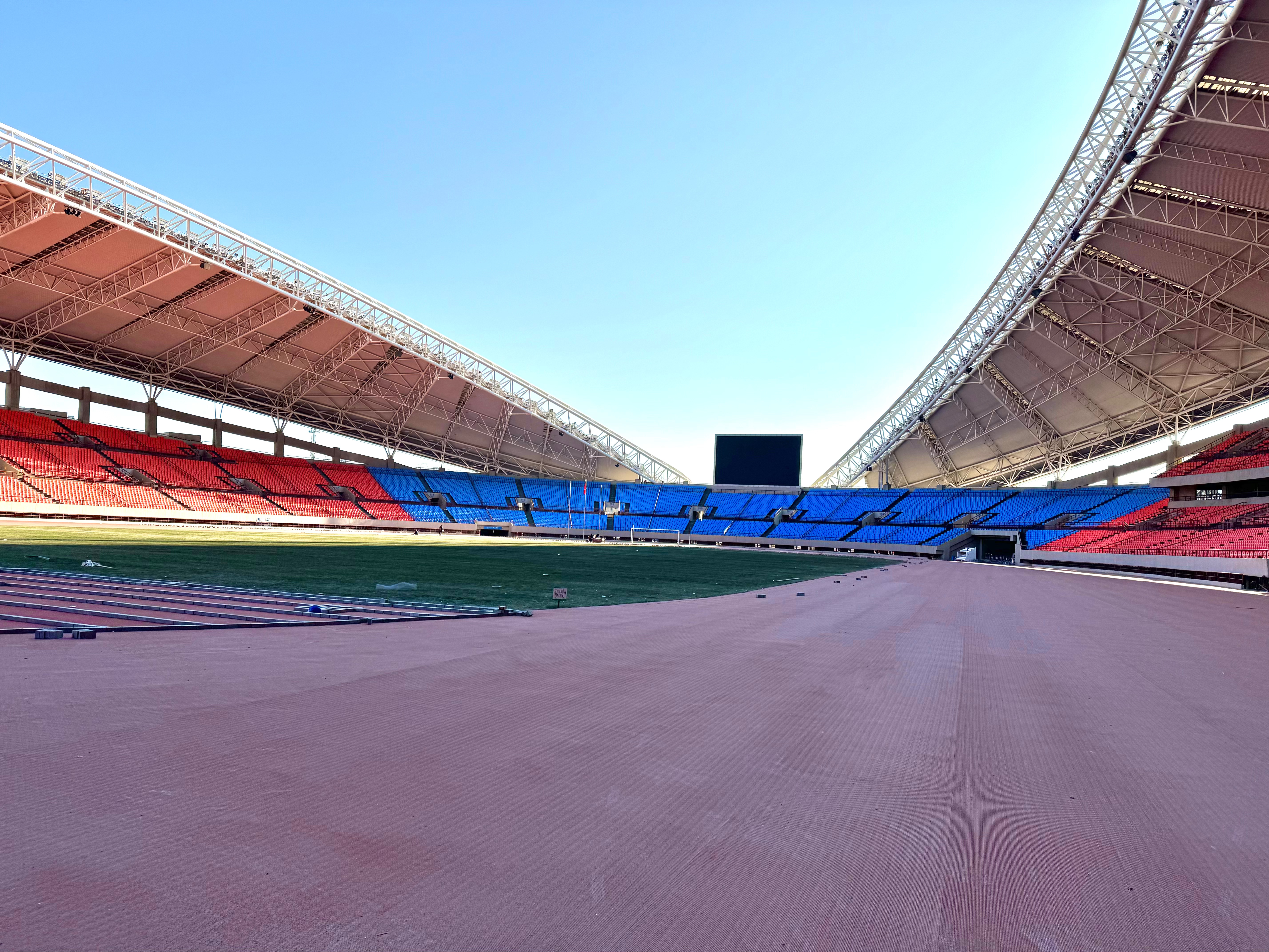 該項(xiàng)目地處建設(shè)路南側(cè)、建華路西側(cè)、奧林匹克大街北側(cè),是第十一屆中俄蒙國際青少年運(yùn)動會及 2026年內(nèi)蒙古自治區(qū)第十六屆運(yùn)動會的主場館。此次完工的橡膠跑道為一類A級標(biāo)準(zhǔn),需嚴(yán)格遵循《田徑競賽與技術(shù)規(guī)則》要求,各項(xiàng)物理性能參數(shù)均達(dá)國家級賽事標(biāo)準(zhǔn)。施工材料均選用經(jīng)中國田徑協(xié)會審定、且具備國內(nèi)外大型賽事應(yīng)用實(shí)績的知名品牌,完工后將由國家體育總局下屬具備CMA/CNAS認(rèn)證資質(zhì)的檢測機(jī)構(gòu)進(jìn)行專業(yè)驗(yàn)收。