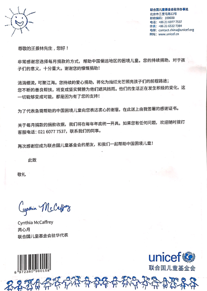 在信的最后,聯(lián)合國兒童基金會駐華代表再次代表急需幫助的中國困境兒童向該同志表達了衷心的謝意。