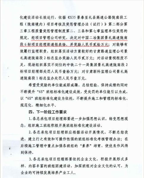景禮項目部精心組織,合理安排,認真組織實施。5月23日-24日,項目管理公司對各總承包項目經理部“6S” 班組標準化建設進展情況進行了專項檢查,重點檢查了鋼筋加工場、拌合站、交通產品倉庫和預制場等場站班組標準化建設、現場“6S” 實施情況、“微 改創”應用、教育培訓、安全管理和宣傳等方面。依據《S35 景泰至禮縣高速公路隴南段工程(隴南境內)項目考核及獎懲管理辦法(試行)》第二部分第三章工程質量獎懲管理制度第二、三條和第七章監理單位獎懲的規定,經項目管理公司研究,決定對中國二冶集團景禮高速隴南段6標項目經理部通報表揚,并獎勵人民幣貳拾萬元。