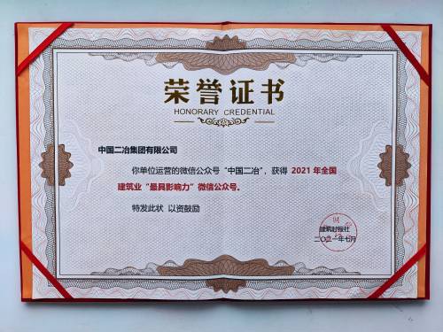 “中國二冶”微信公眾號憑借獨特的審美設計能力、深入透徹的分析思考、及時準確的新聞資訊和豐富精彩的企業文化互動方式,以及引起廣泛關注和討論的大量原創觀點,在孜孜不倦的運營、維護、更新下,終獲肯定,榮獲“2021年全國建筑業最具影響力公眾號”的榮譽稱號;此獎項的獲得進一步提升了中國二冶的品牌知曉度和社會影響力,為公司高質量穩健發展營造了良好氛圍。