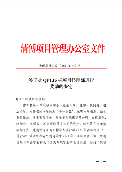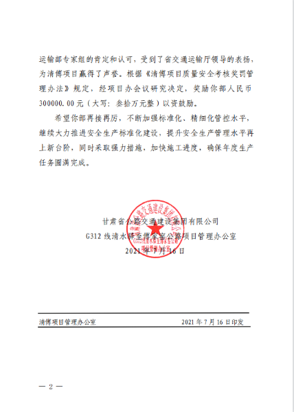 7月20日,因中國二冶集團清傅項目部在交通運輸部平安工地建設專家巡回指導專項行動 2021 年西部片區(qū)“三送行動”活動中和省交通運輸廳 2021 年上半年全省公路工程建設項目綜合督查和設計變更專項督查中表現(xiàn)突出,獲得清傅項目辦獎勵人民幣30萬元。