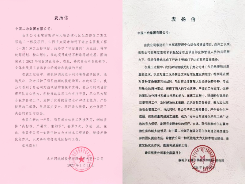 兩封表揚(yáng)信真摯誠懇、情真意切,是對中國二冶高質(zhì)量施工管理和匠心鑄造精品工程的一致認(rèn)可。下一步,中國二冶將繼續(xù)發(fā)揚(yáng)“彰顯央企擔(dān)當(dāng),鑄就永恒精品”的企業(yè)使命,圓滿完成后續(xù)各項工作任務(wù),確保項目高質(zhì)量完美履約,為公司與業(yè)主交上一份滿意答卷。