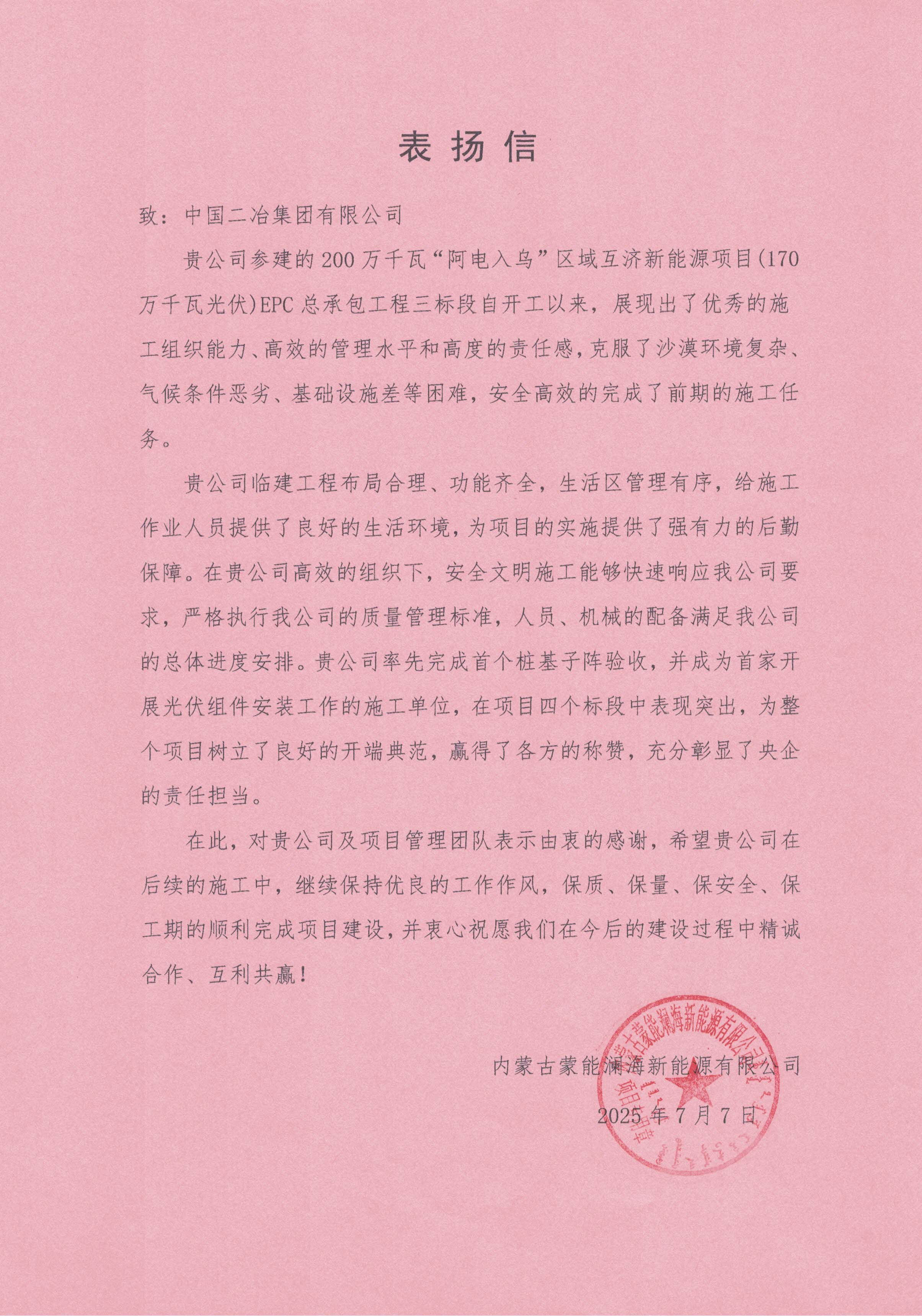 近日,中國二冶收到內蒙古蒙能瀾海新能源有限公司表揚信,對中國二冶200 萬千瓦“阿電入烏”區域互濟新能源項目(170萬千瓦光伏)EPC總承包工程三標段施工中的出色表現予以高度肯定。