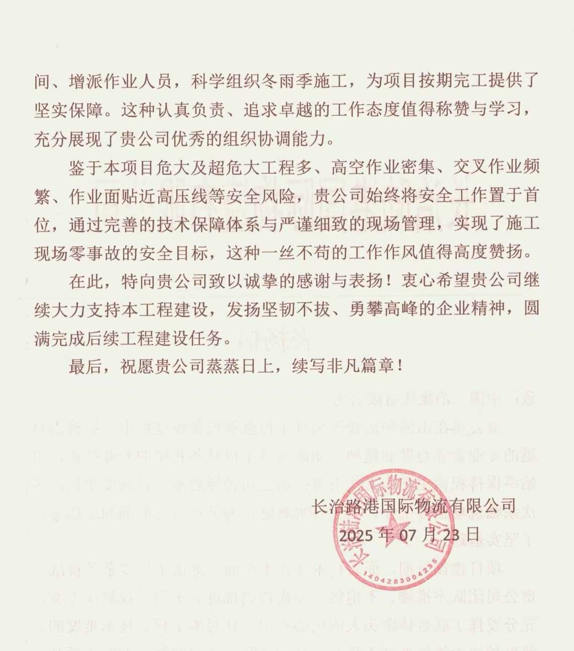信中指出,工程自進(jìn)場施工以來,貴公司領(lǐng)導(dǎo)對本項目高度重視,多次親臨現(xiàn)場指導(dǎo)工作、攻克技術(shù)難題,為節(jié)點目標(biāo)的順利達(dá)成奠定了堅實基礎(chǔ)。在實施過程中,項目管理團(tuán)隊攻克多項技術(shù)難關(guān),保質(zhì)保量按照計劃實現(xiàn)了預(yù)期目標(biāo),彰顯了項目團(tuán)隊卓越的技術(shù)實力。特別是施工關(guān)鍵時期,由于本項目存在危大及超危大工程多,高空作業(yè)密集,交叉作業(yè)頻繁等安全風(fēng)險,為此,項目管理團(tuán)隊始終將安全工作置于首位,通過完善的技術(shù)保障體系與嚴(yán)謹(jǐn)細(xì)致的現(xiàn)場管理,實現(xiàn)了施工現(xiàn)場零事故的安全目標(biāo)。