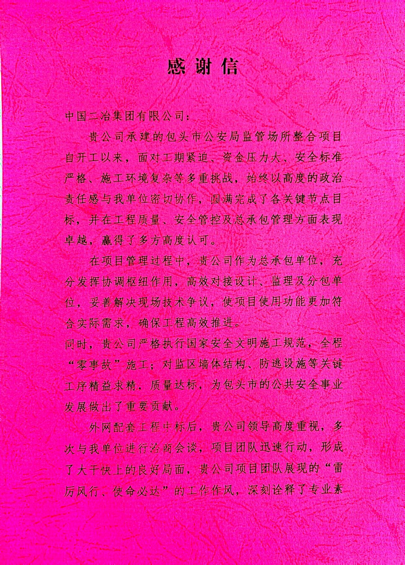 信中指出,貴公司作為總承包單位,充分發揮協調樞紐作用,高效對接設計、監理及分包單位,妥善解決現場技術爭議,使項目使用功能更加符合實際需求,確保工程高效推進。同時嚴格執行國家安全文明施工規范,全程“零事故”施工;對監區墻體結構、防逃設施等關鍵工序精益求精,質量達標,為包頭市的公共安全事業發展做出了重要貢獻。今年,在外網配套工程中標后,貴公司第一時間響應,相關領導高度重視,多次與我單位進行洽商會談,項目團隊迅速行動,人、材、機第一時間到位,形成了大干快上的良好局面,項目團隊展現的 “超越自我、挑戰極限”的作風,以及使命必達的執行力,深刻詮釋了專業素養與國企擔當。