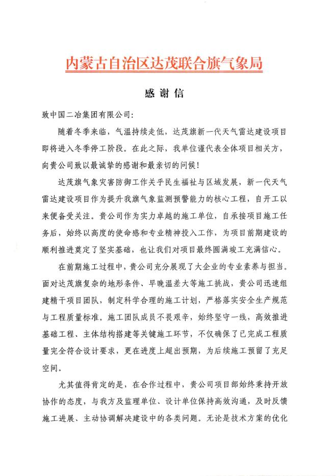 11 月 16 日,中國二冶收到內蒙古自治區(qū)達茂聯合旗氣象局發(fā)來的感謝信,信中對公司在達茂旗新一代天氣雷達建設項目施工中的專業(yè)表現與辛勤付出給予高度肯定,并致以誠摯感謝。