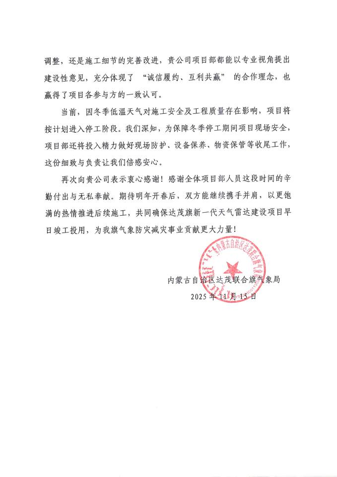 合作期間,項目部始終秉持開放協作態(tài)度,與氣象局、監(jiān)理單位及設計單位建立高效溝通機制,及時反饋施工進展,主動協調解決建設中的各類問題。同時,在技術方案優(yōu)化、施工細節(jié)完善等方面積極提出建設性意見,切實踐行 “誠信履約、互利共贏” 的合作理念,贏得了項目各參與方的一致認可。針對冬季低溫天氣對施工安全及工程質量的影響,項目部還細致部署現場防護、設備保養(yǎng)、物資保管等冬季停工收尾工作,盡顯嚴謹負責的工作態(tài)度。 此次感謝信的送達,極大鼓舞了項目部全體人員的士氣,既是對中國二冶高質量管理與實干擔當的充分認可,也為團隊注入了強勁動力。
