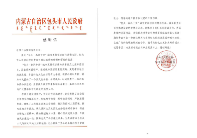此次感謝及表揚,既是對中國二冶建設成果的高度認可,也是對團隊付出的充分信賴。未來,中國二冶將以此為激勵,持續深耕包頭城市建設領域,以更多優質精品工程賦能地方發展,為推動地區經濟社會高質量發展貢獻更大央企力量。