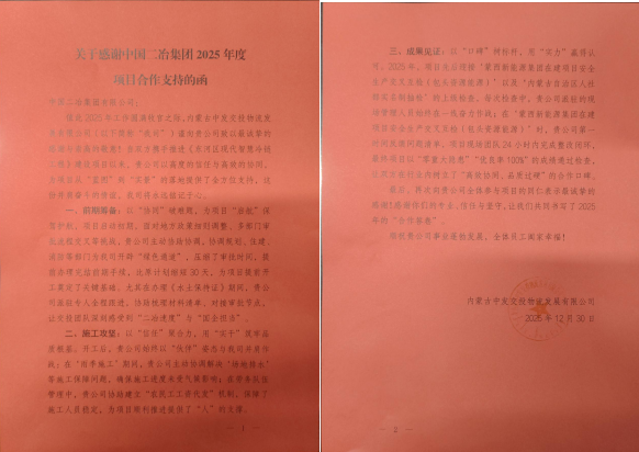 信中指出,在項目籌備工作中,面對地方政策細則調整、多部門審批流程交叉等挑戰(zhàn),貴公司能主動協(xié)助協(xié)調規(guī)劃、住建、消防等部門,開辟“綠色通道”,壓縮了審批時間,提前辦理完結前期手續(xù),比原計劃縮短30天,為項目提前開工奠定了關鍵基礎。以協(xié)同“破題”,為項目啟航保駕護航,尤其在辦理《水土保證》期間,貴公司派駐專人全程跟進,協(xié)助梳理材料清單、對接審批節(jié)點,讓交投團隊深刻感受到“二冶速度”與“國企擔當”。