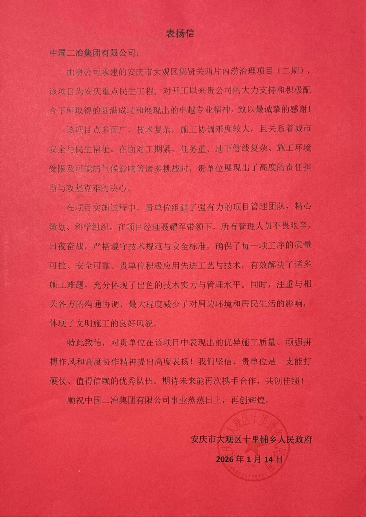 1月15日,中國二冶收到安慶市大觀區(qū)十里鋪鄉(xiāng)人民政府發(fā)來的表揚(yáng)信,對公司在安慶市大觀區(qū)集賢關(guān)西片內(nèi)澇治理項(xiàng)目(二期)的圓滿履約給予高度肯定,對項(xiàng)目團(tuán)隊(duì)展現(xiàn)出的專業(yè)精神與責(zé)任擔(dān)當(dāng)致以誠摯感謝。