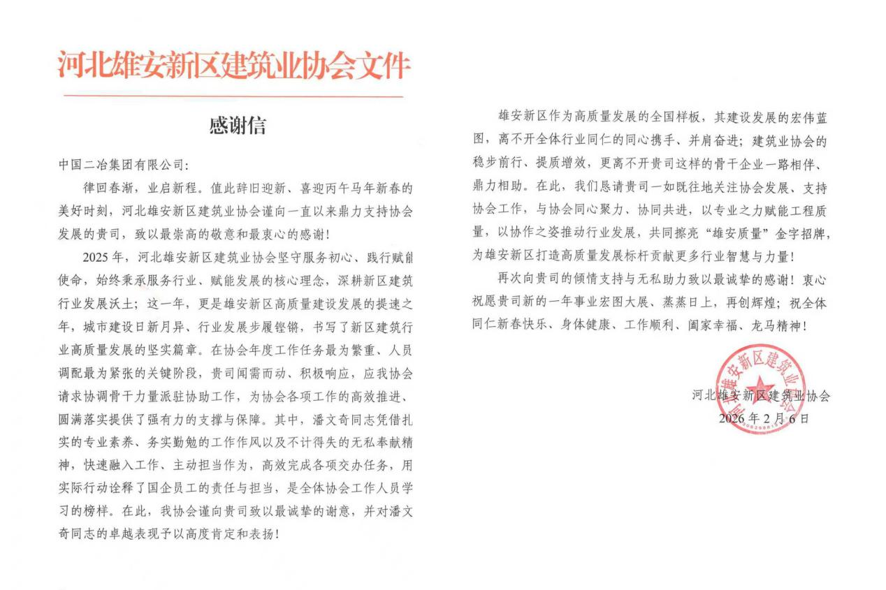 感謝信指出,中國二冶始終堅守初心、履職盡責,在項目建設中搶工期、保質量、守安全、促環(huán)保,不僅高效推進各項工程節(jié)點順利落地,更積極參與新區(qū)工程建設行業(yè)交流,主動分享建設經(jīng)驗,助力提升區(qū)域建筑業(yè)整體發(fā)展水平,為雄安新區(qū)大規(guī)模建設與高質量發(fā)展注入了強勁動力,用實際行動生動詮釋了央企的責任與擔當。