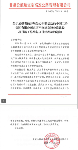 5月18日,根據甘肅公航旅定臨高速公路管理有限公司(甘公定臨〔2020〕133)號文件獲悉,定臨高速項目為定西市安定區內官營鎮官亭村捐贈1.6公里道路硬化所需材料受表揚。