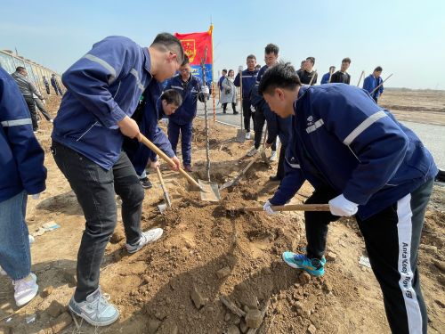 青年朋友們認真聆聽工人師傅講解植樹方法步驟和注意事項后,帶上鐵鍬和種植工具,井然有序地開始樹苗種植?;顒蝇F場,大家植樹造林的熱情十分高漲,有的奮力揮鍬挖坑填土,有的扶苗踩實,分工協作,密切配合,個個忙的滿頭大汗,干得熱火朝天。經過一番忙碌的勞動,一排排新栽樹苗在春日里迎風挺立,為大地增添了一抹生機。