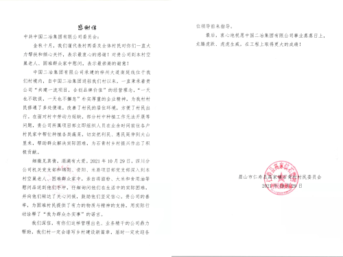 細微見真情,涓滴有大愛。一封感謝信,寄托了當地村民對中國二冶的信任和期盼。四川分公司將繼續落實“我為群眾辦實事”實踐活動,深化黨建引領,持續提升服務水平,切實履行作為央企的政治責任、社會責任,真正成為頂梁柱、壓艙石,將社會責任意識融入到企業發展實踐中,認真做好每一項對當地群眾有益的工作,給當地群眾帶來更多的幸福感。