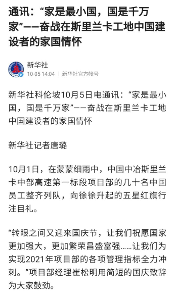 10月5日,新華社以《“家是最小國(guó),國(guó)是千萬(wàn)家”——奮戰(zhàn)在斯里蘭卡工地中國(guó)建設(shè)者的家國(guó)情懷》為題對(duì)中國(guó)中冶斯里蘭卡中部高速第一標(biāo)段項(xiàng)目部進(jìn)行特別報(bào)道。項(xiàng)目工作人員在采訪中表示,“家是最小國(guó),國(guó)是千萬(wàn)家”,作為在海外參與“一帶一路”項(xiàng)目的建設(shè)者,我們懷有一種使命感和責(zé)任感,盡管有時(shí)需要為此作出個(gè)人犧牲。當(dāng)看到通過(guò)自己的努力,斯里蘭卡基礎(chǔ)設(shè)施日新月異、旅游業(yè)蓬勃發(fā)展,我們感到由衷高興和自豪。
