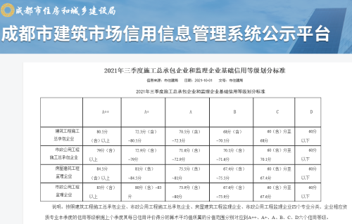 10月8日,成都市建筑市場信用信息管理系統(tǒng)公示平臺(tái)數(shù)據(jù)顯示,中國二冶在成都地區(qū)信用等級二、三季度蟬聯(lián)A++。進(jìn)一步樹立起了中國二冶在蜀良好的誠信品牌形象。
