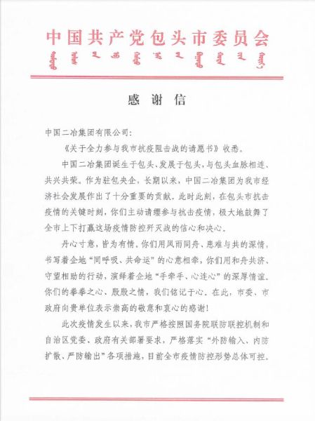 感謝信中指出,中國二冶集團誕生于包頭、發展于包頭,與包頭血脈相連、共興共榮。作為駐包央企,長期以來,中國二冶集團為包頭市經濟社會發展作出了十分重要的貢獻。在包頭市抗擊疫情的關鍵時刻,主動請纓參與抗擊疫情,極大地鼓舞了全市上下打贏這場疫情防控殲滅戰的信心和決心。